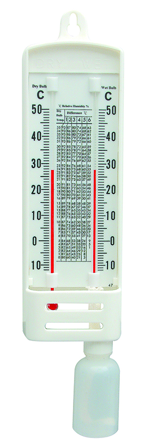 This thermometer is a water-based instrument that measures relative humidity in rooms or other large areas.